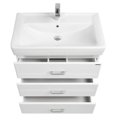 Современная лаконичная тумба под раковину AQUATON Америна 60 М с тремя ящиками имеет ширину 60 см и выполнена в белоснежном глянцевом цвете. Корпус изготовлен из влагостойкой ЛДСП, а фасад - из высококачественной МДФ. Модификация на двух изящных ножках удобна для ванных комнат, где нельзя использовать подвесную мебель. Направляющие нижнего крепежа обеспечивают жёсткое и надежное крепление ящиков, а встроенные доводчики гарантируют их бесшумное и плавное закрывание. Дополнительно организовано нижнее подключение труб водоснабжения и канализации. Корпус и фасады покрыты полиэфирной краской ультрафиолетового отверждения, обеспечивающей дополнительную защиту от влаги.